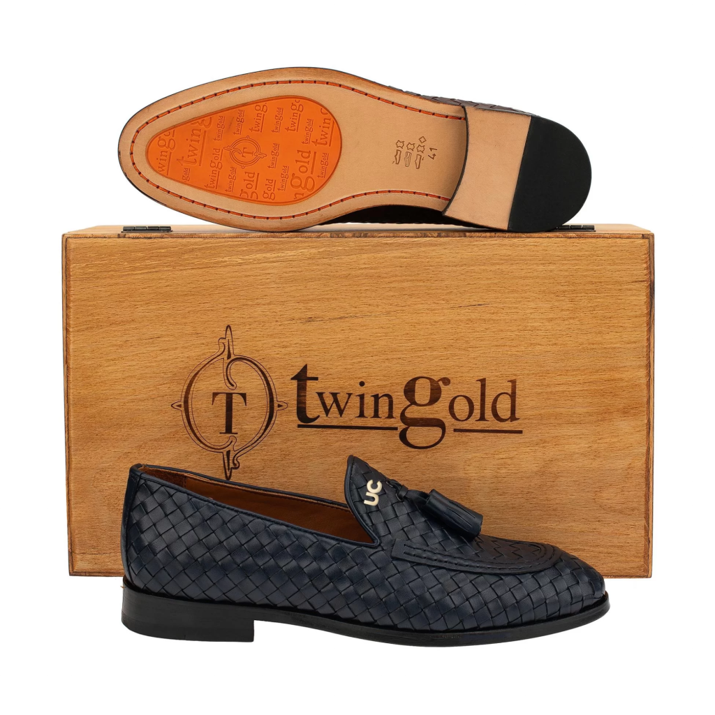 İsme Özel El Örgüsü Kösele Erkek Ayakkabı - %100 Hakiki Deri - Altın Harf - AA01002 - Lacivert