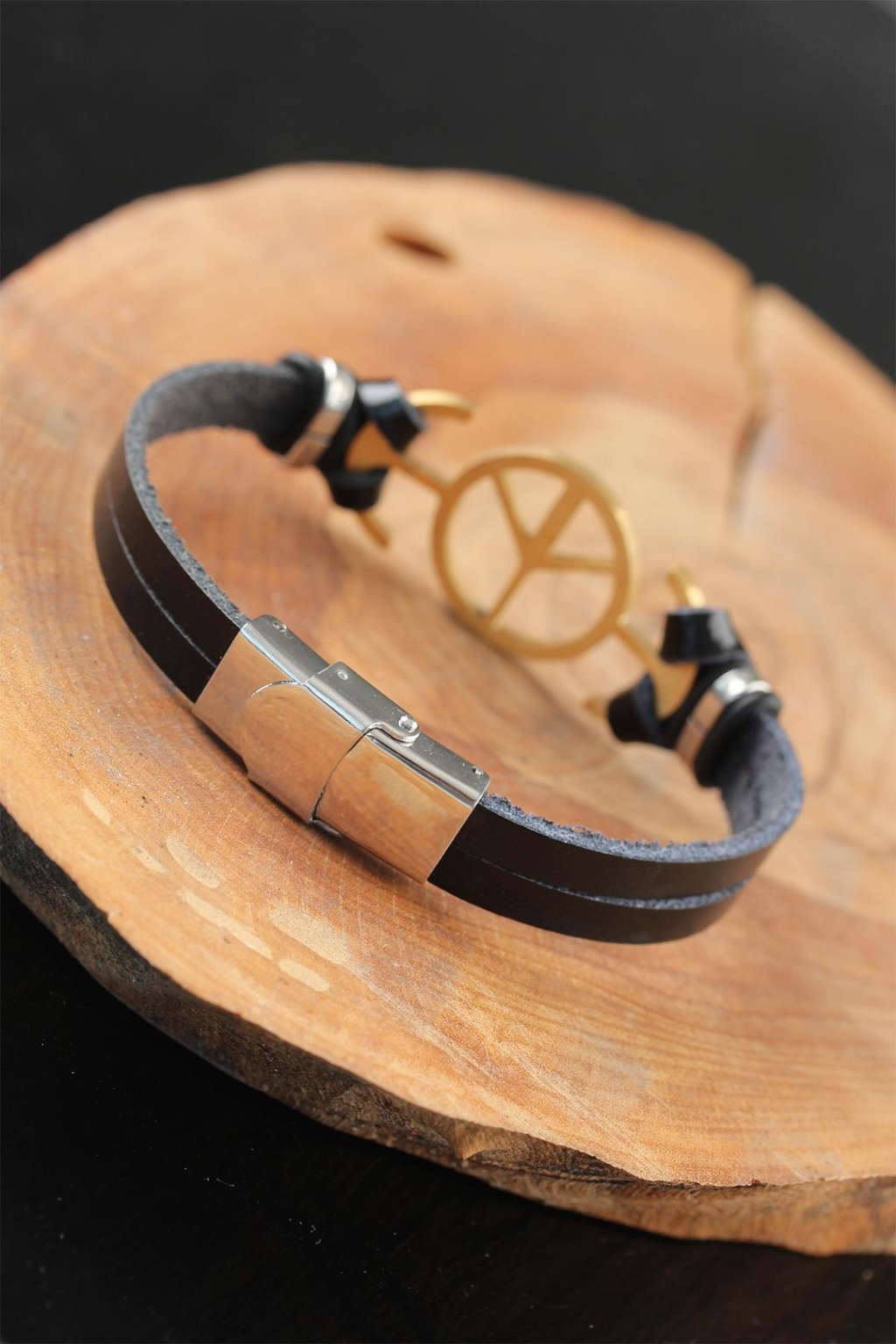 Kombinlerinizi Gold Renk Barış Figürlü Metal Aksesuarlı Siyah Renk Deri Erkek Bileklik ile şıklığa ulaştırın.