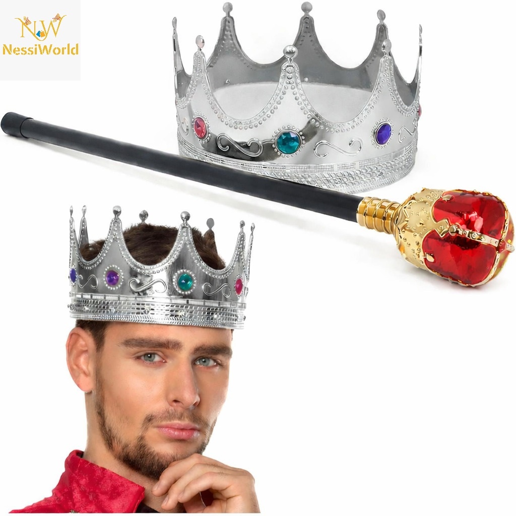 Gümüş Kral Tacı Kraliyet Tacı 60 cm ve Kırmızı Topuzlu Kral Asası Seti