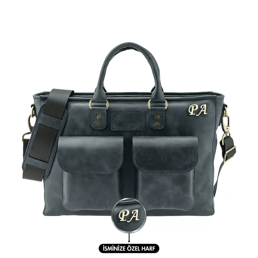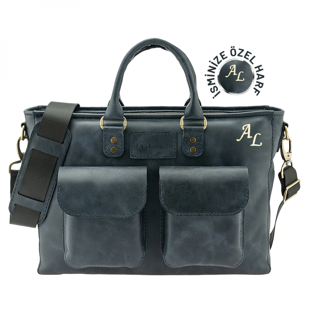 İsme Özel Askılı Cepli Evrak - Laptop Çantası - %100 Rainbow Deri - AC09002 - Lacivert