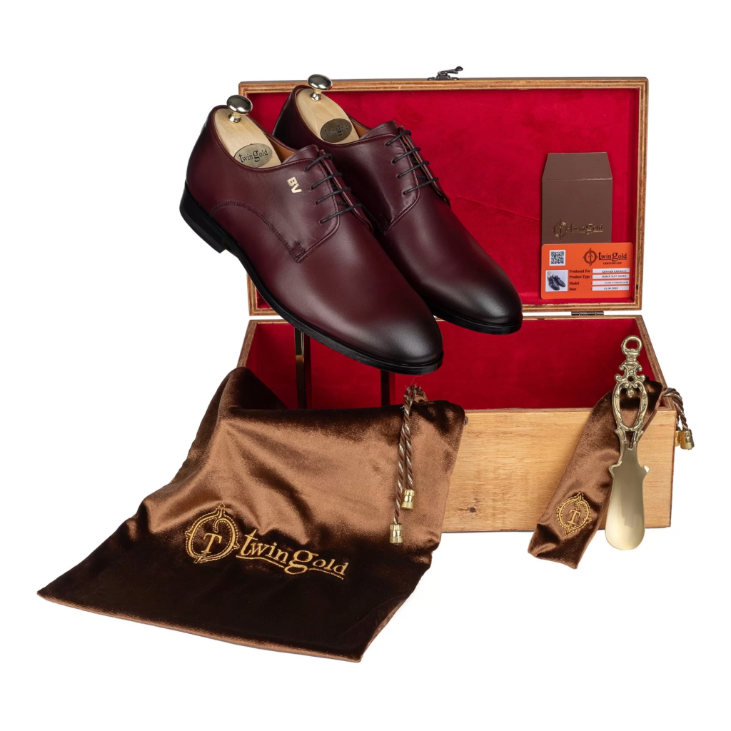 Altın harfli ayakkabılarımız ahşap kutusunda, meşe kalıp, pirinç çekecek, altın sertifikası ve toz torbasıyla birlikte gönderilmektedir.
