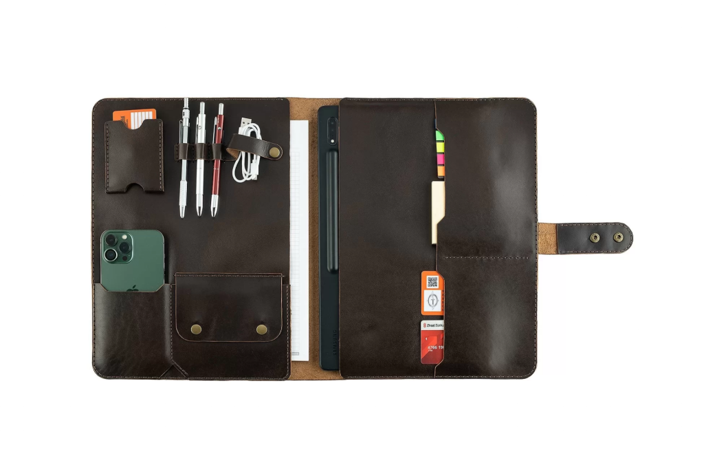 • Üründe 2 adet büyük bölme, 2 adet pasaport  veya cüzdan bölmesi , 3’lü kalem yuvası, çıtçıtlı kablo düzenleme yuvası, çıkartılabilir kartlık,