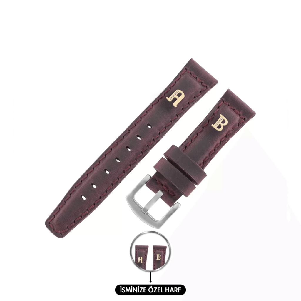 İsme Özel El Dikişli Saat Kordonu - %100 Crazy Deri - AG03002 - Bordo