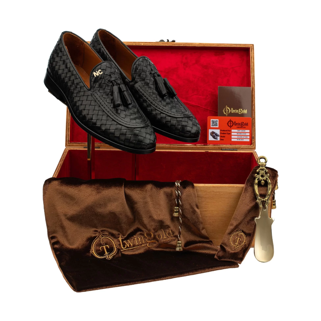 Altın harfli ayakkabılarımız ahşap kutusunda, meşe kalıp, pirinç çekecek, altın sertifikası ve toz torbasıyla birlikte gönderilmektedir.