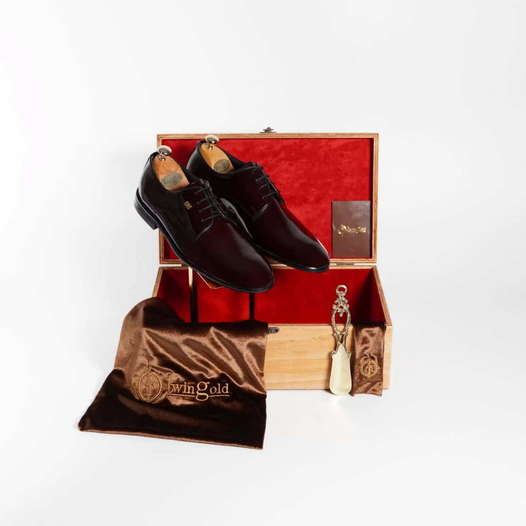 Altın harfli ayakkabılarımız ahşap kutusunda, meşe kalıp, pirinç çekecek, altın sertifikası ve toz torbasıyla birlikte gönderilmektedir.