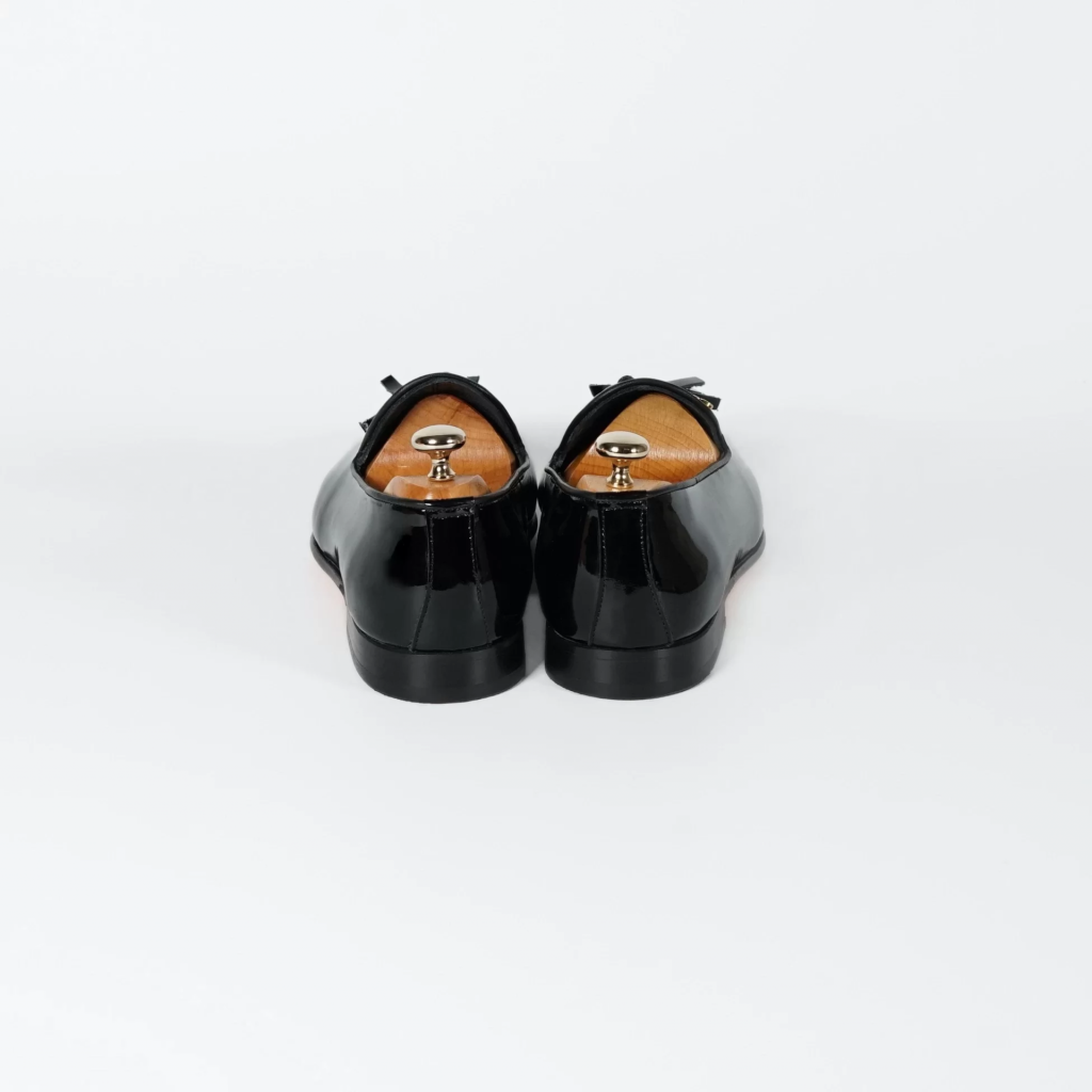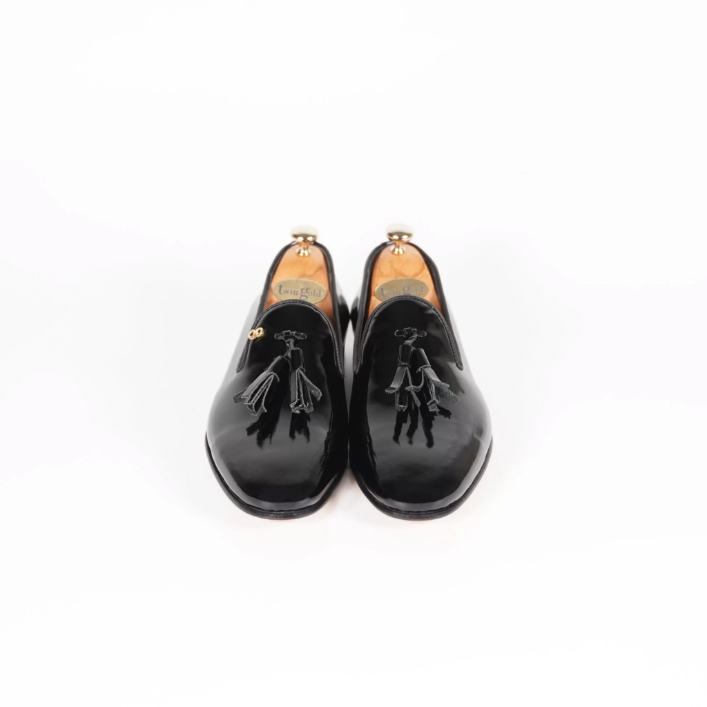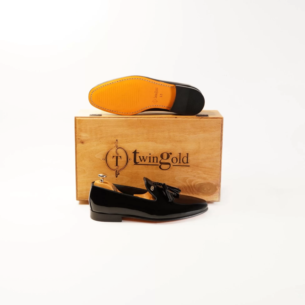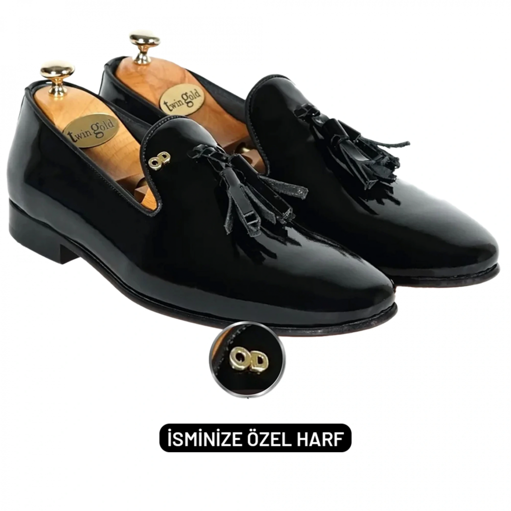 İsme Özel Rugan Püsküllü Kösele Erkek Ayakkabı - %100 Hakiki Deri - Altın Harf - AA01007 - Siyah